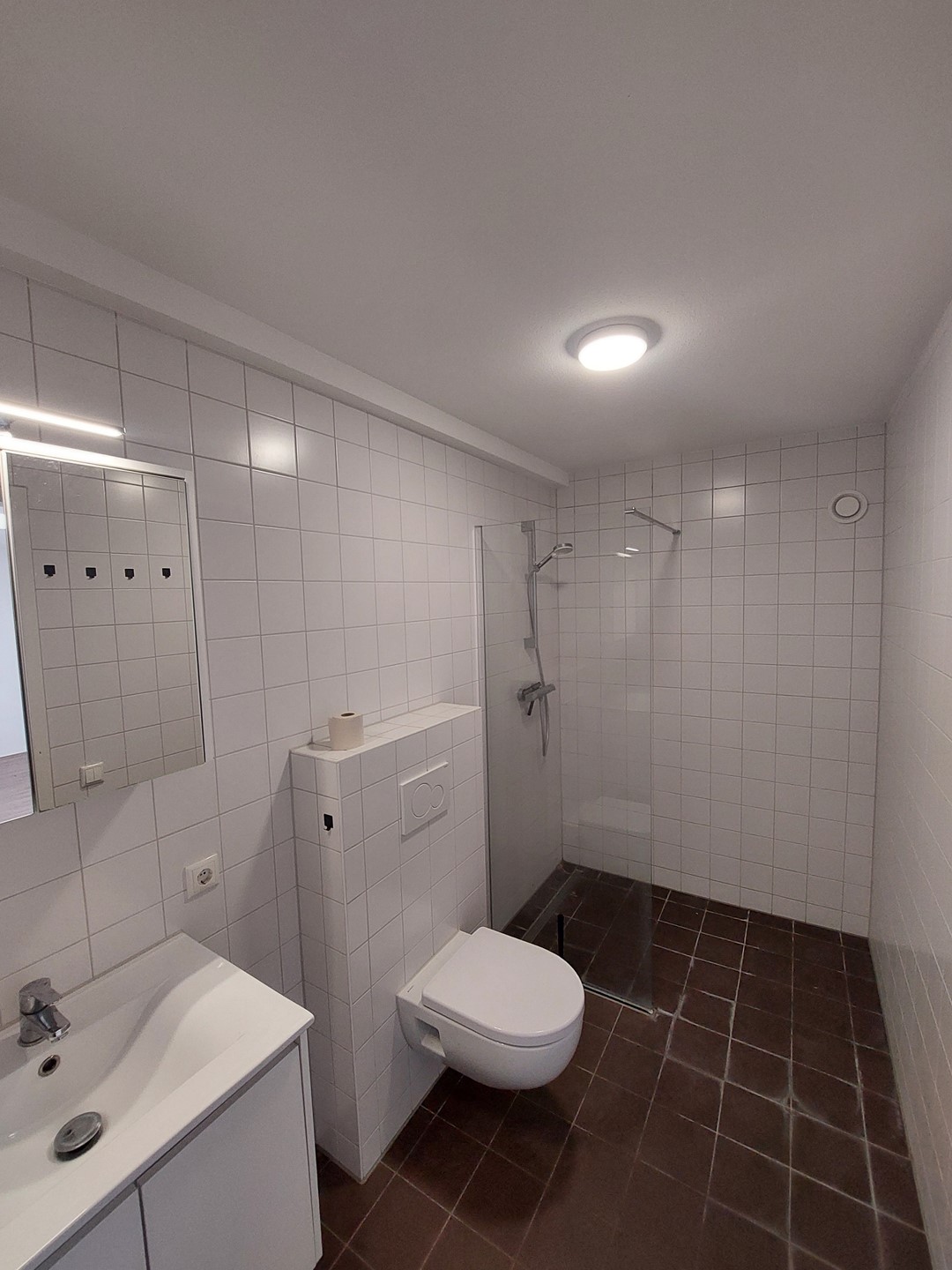De badkamer is heeft een douche, wastafel en zwevend toilet. In het appartement ligt al een pvc vloer en ook gordijnen zijn er al.