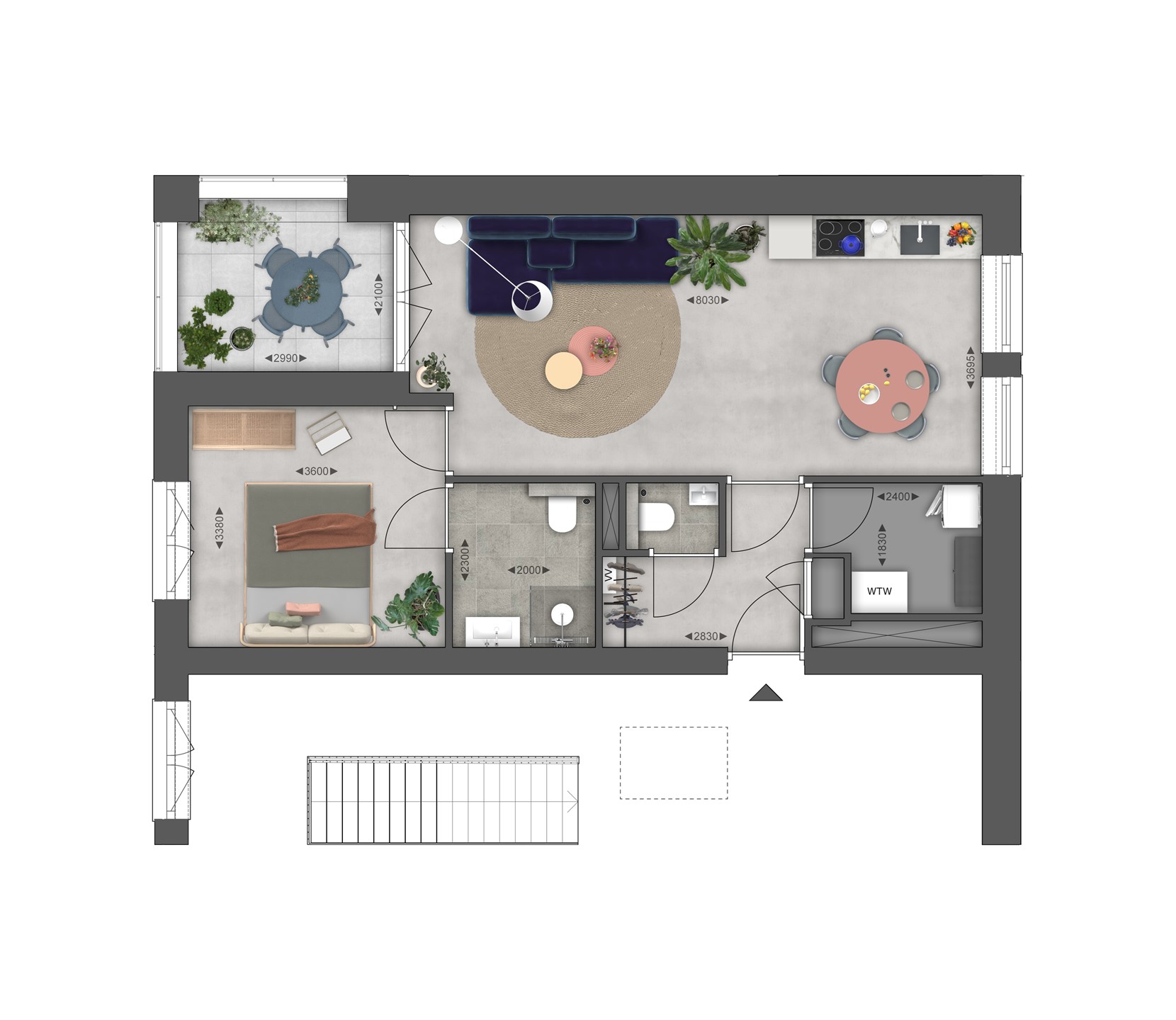 De KoopGarant-woningen zijn identiek aan de reguliere appartementen en hebben een lichte woonkamer met open keuken, één slaapkamer, toilet en een complete badkamer. Via de woonkamer stap je zo je eigen buitenruimte op: een terras van circa 6 m², met keuze uit verschillende zonliggingen. Hier woon je rustig en groen, terwijl het centrum van Groningen eenvoudig per fiets bereikbaar is. Een slimme woonkeuze voor wie mobiliteit, comfort en gemak belangrijker vindt dan een auto voor de deur.