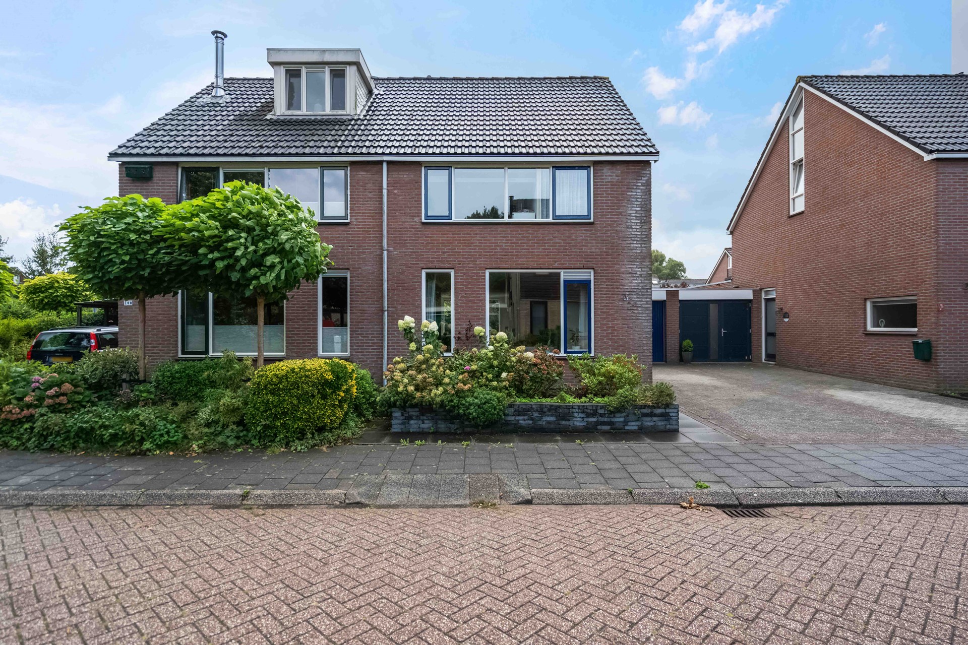 Nette voortuin en ruime oprit. Achter de woning ligt een beschutte tuin op het zuiden. Vanuit de tuin zijn de garage en de aparte berging bereikbaar en er is een achterom.