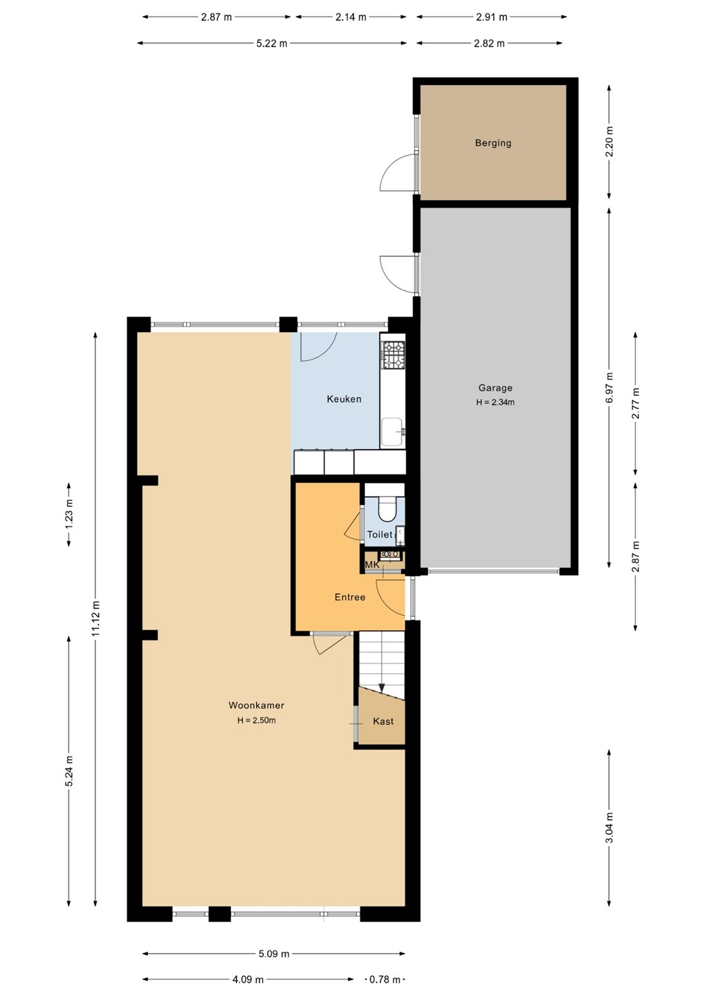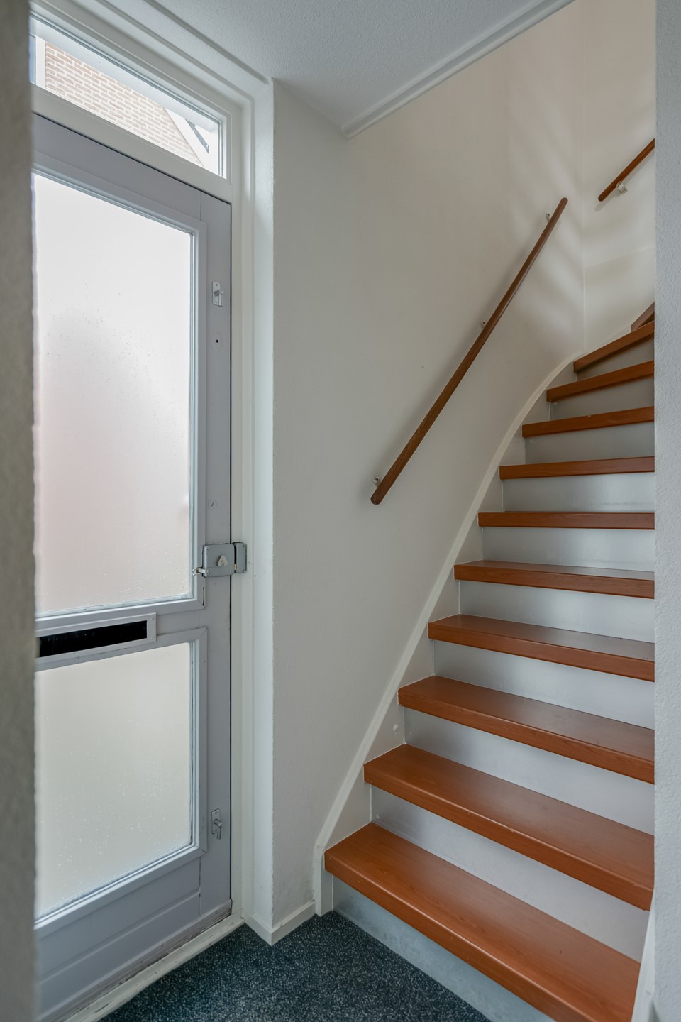 Entree/hal met toilet en meterkast. Ruime woonkamer aan de voorzijde en een woonkeuken aan de achterzijde met veel lichtinval door de grote ramen. De keuken is natuurlijk voorzien van inbouwapparatuur en er is eenhandige trapkast.