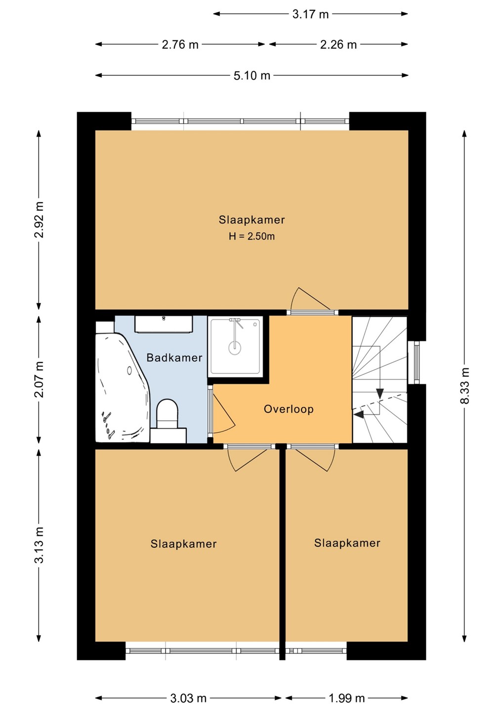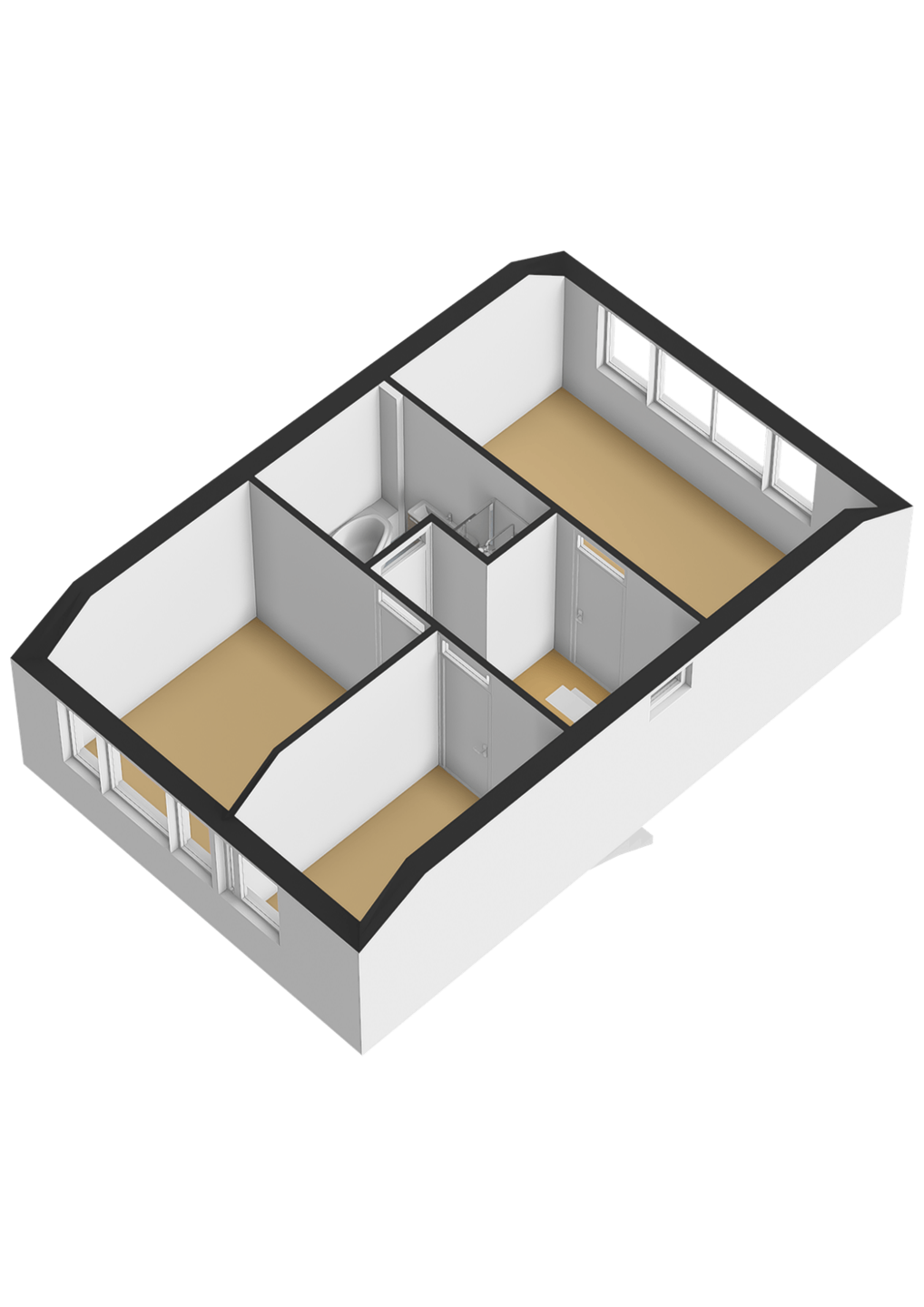 Overloop met drie slaapkamers (ca. 15 m², 9,5 m² en 6 m²) en de badkamer met ligbad en aparte douche.