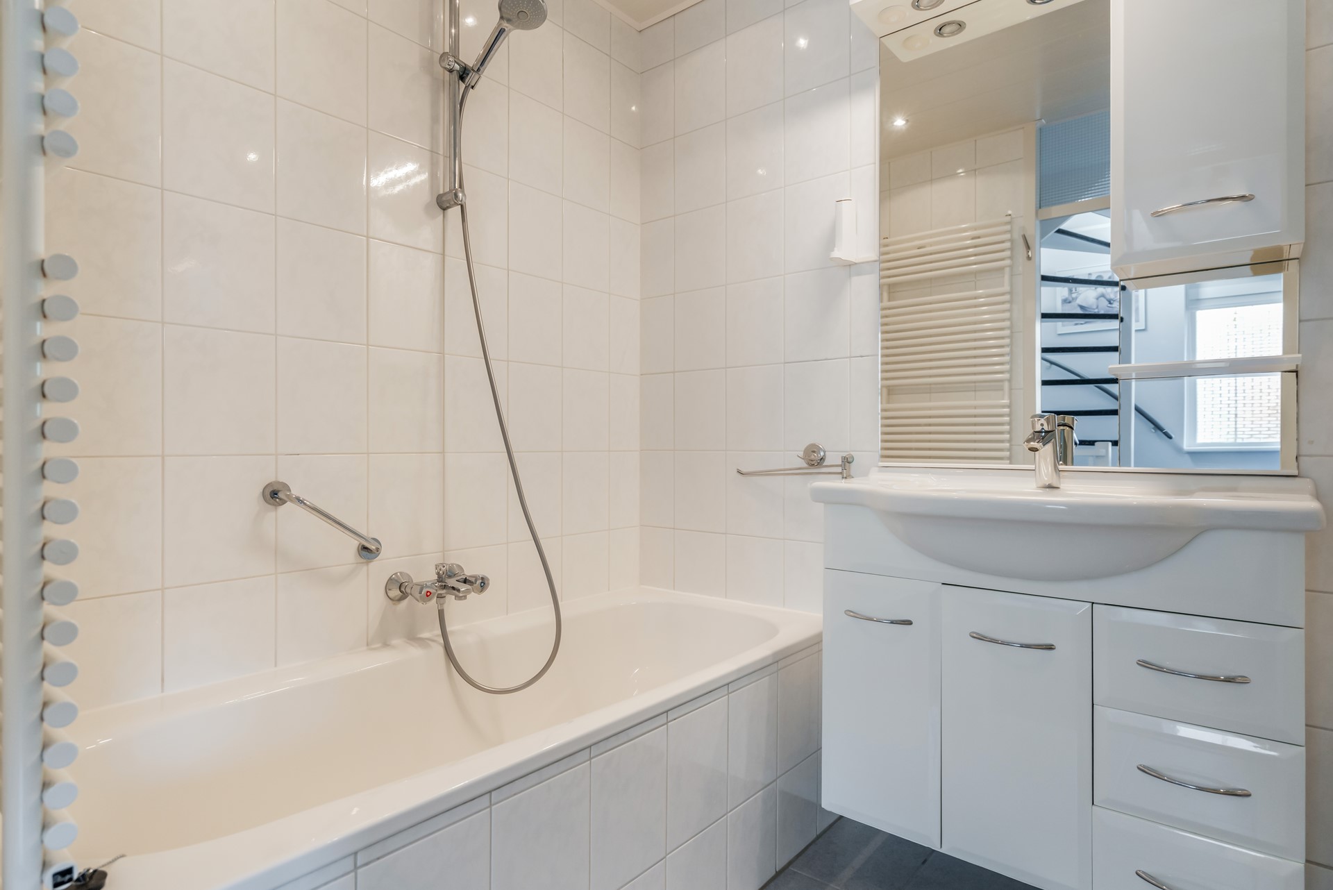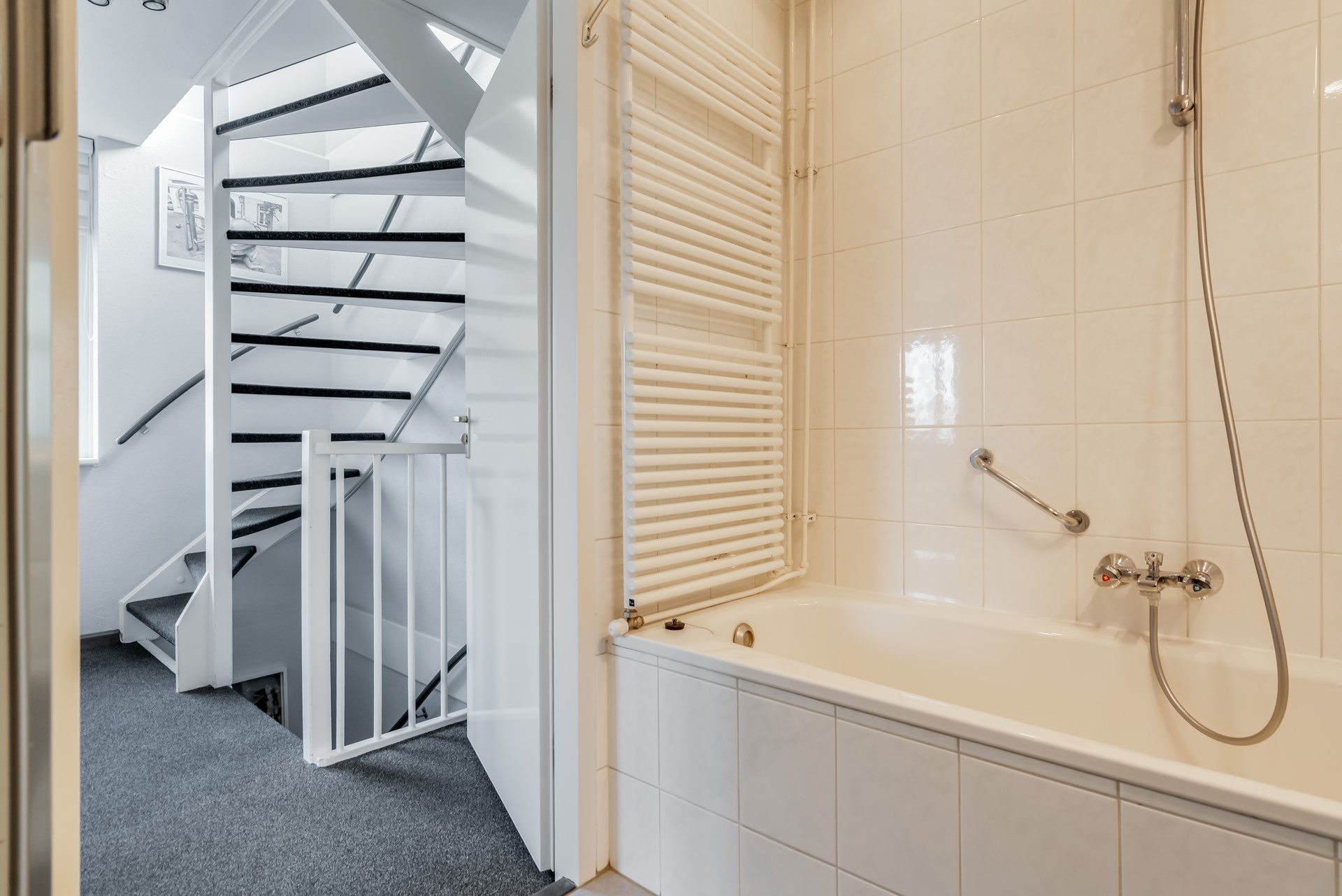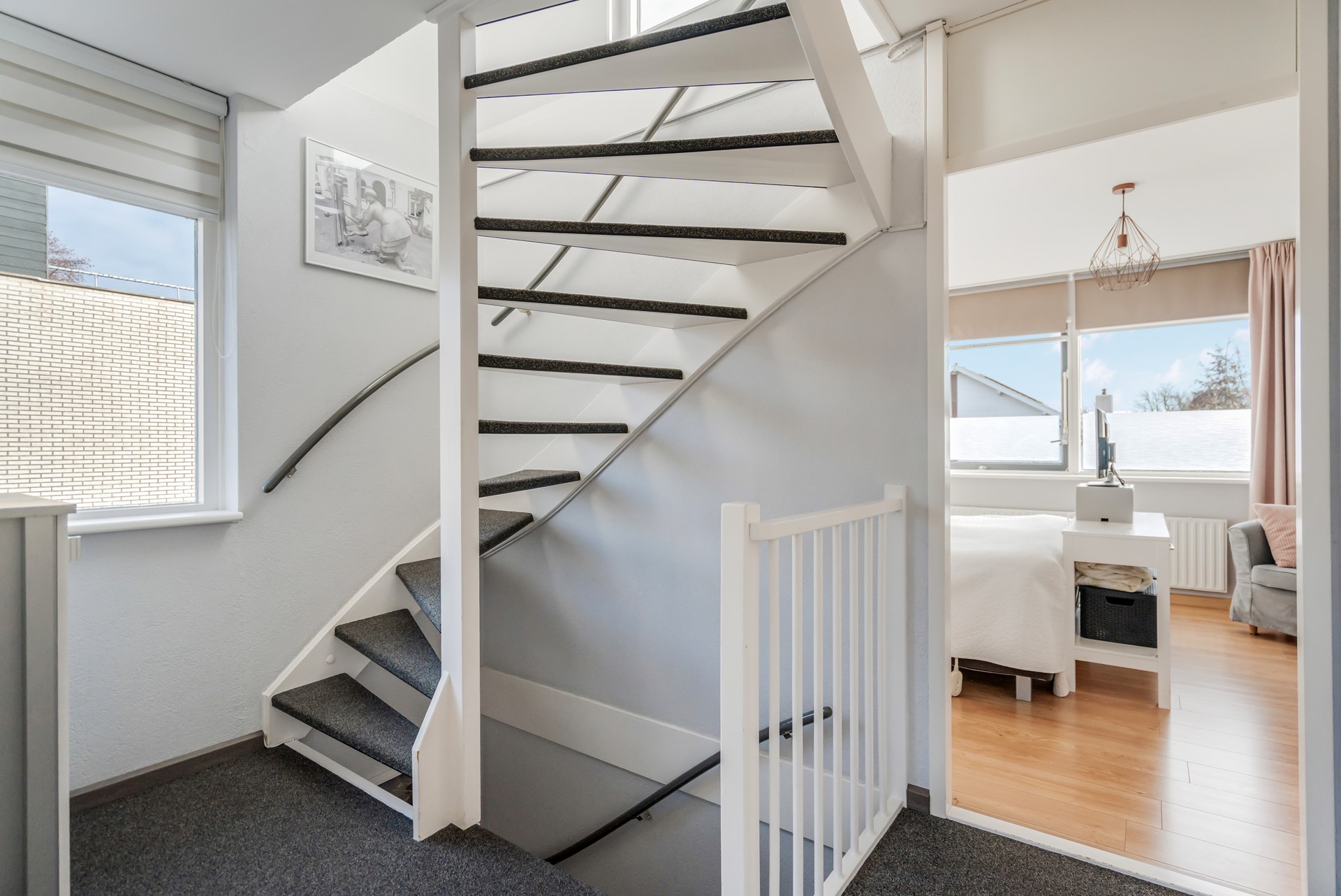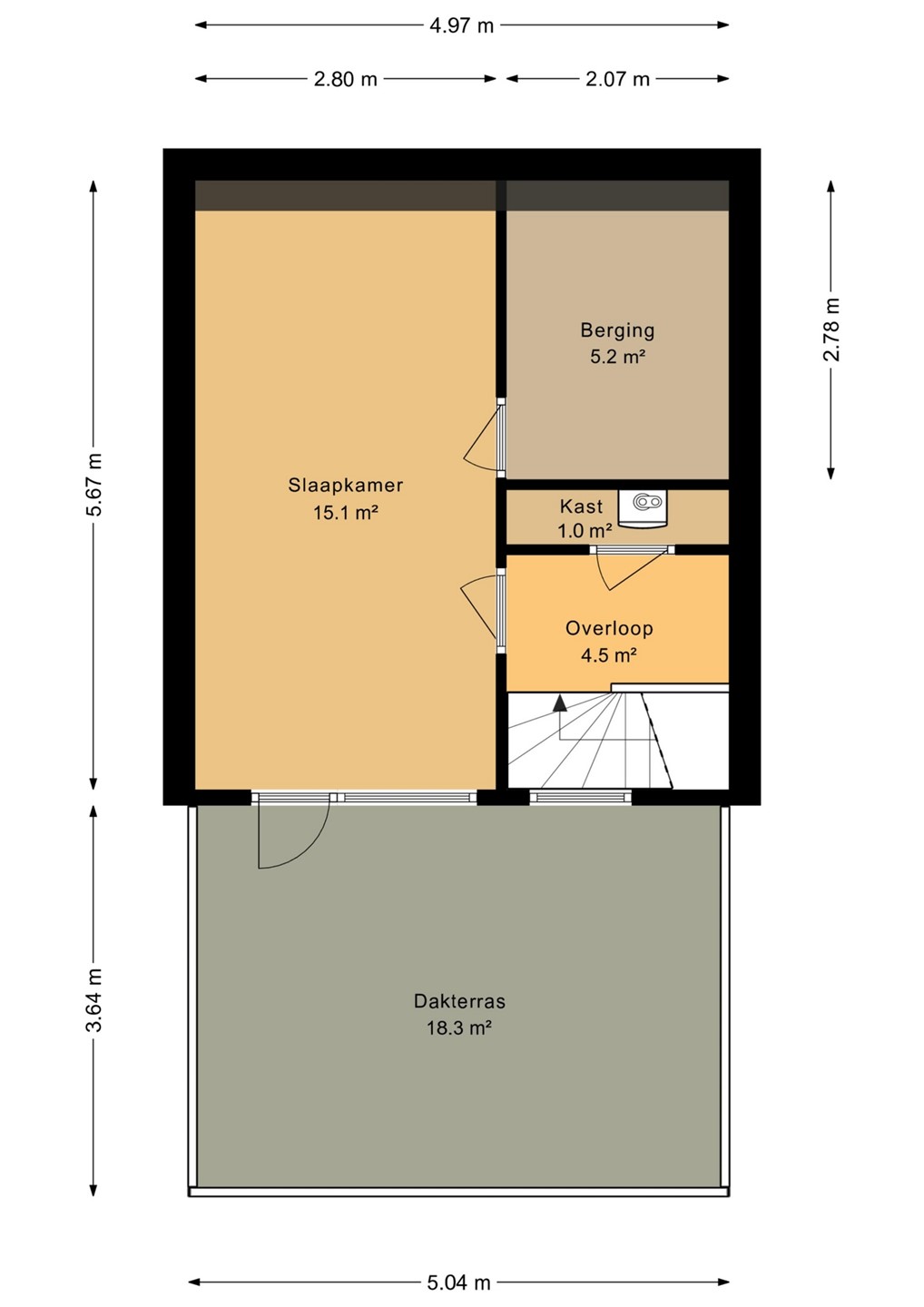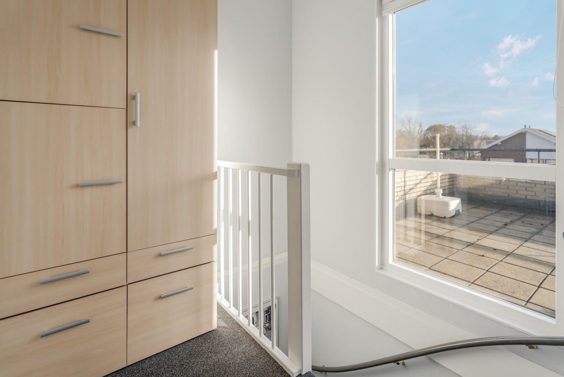 Op de bovenste verdieping vind je een overloop met CV-ruimte, een nette slaapkamer, veel bergruimte én toegang tot het royale dakterras.