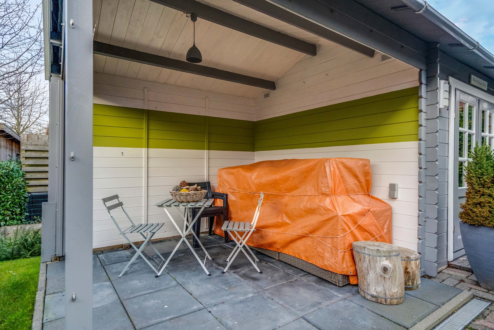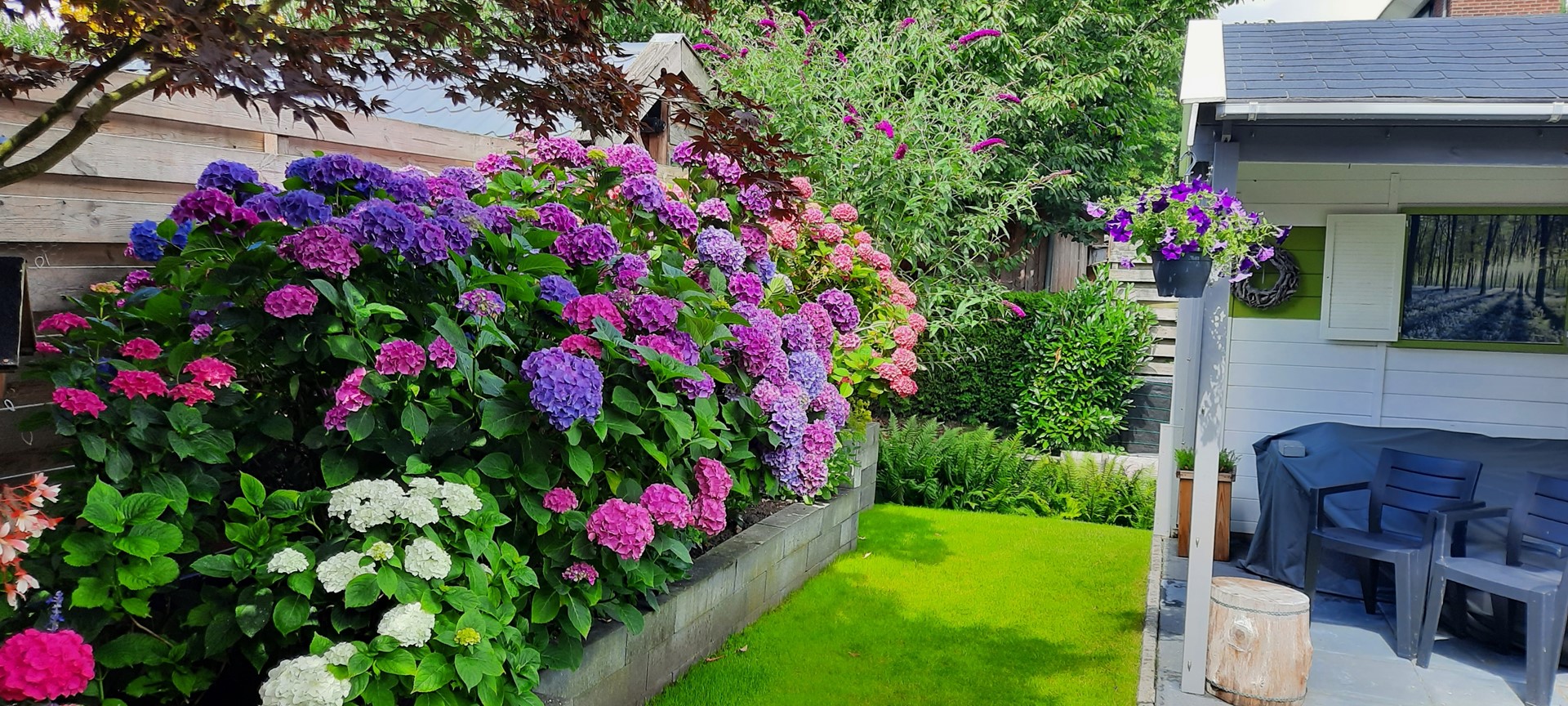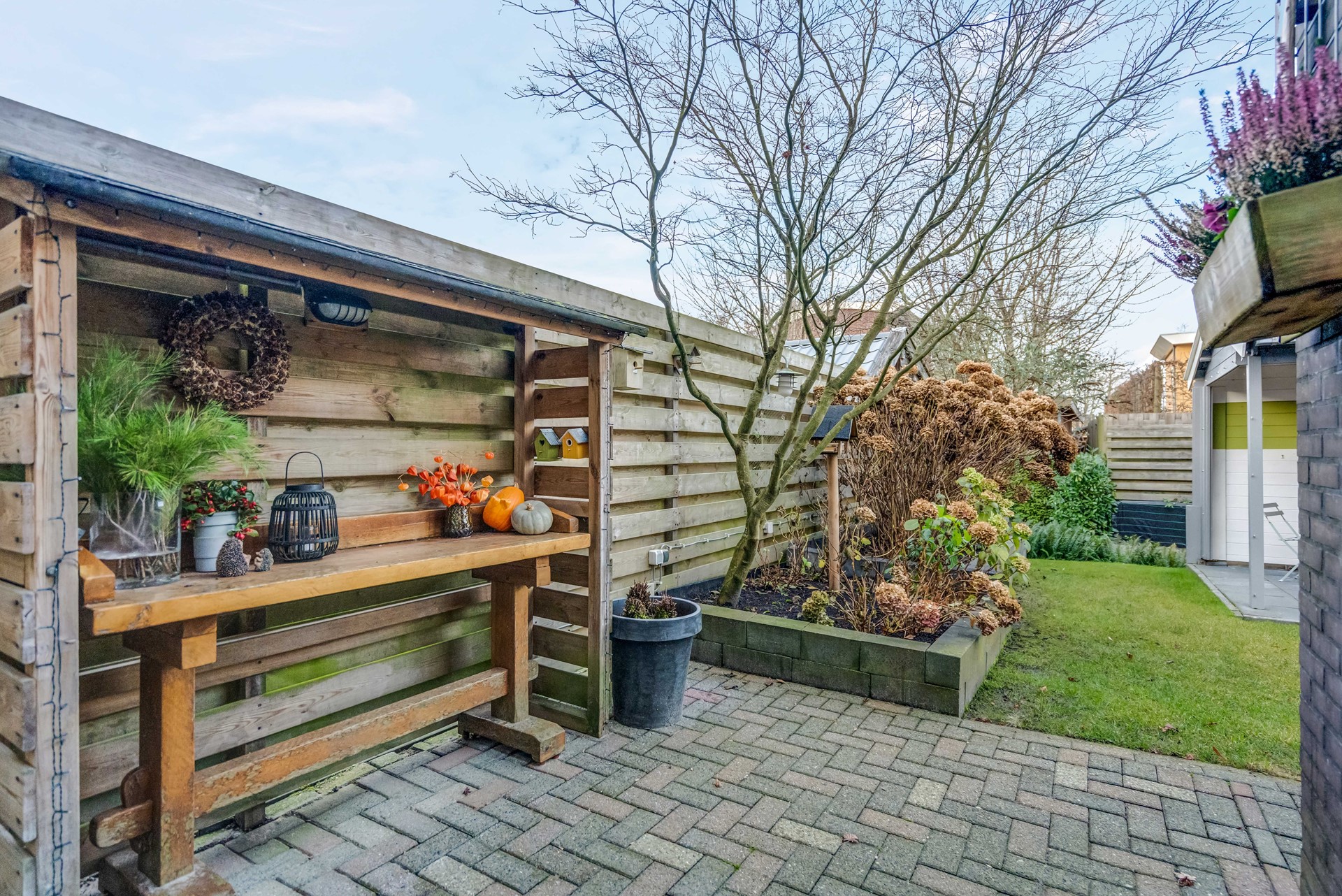 • Beschutte achtertuin met tuinhuisje en overkapping
