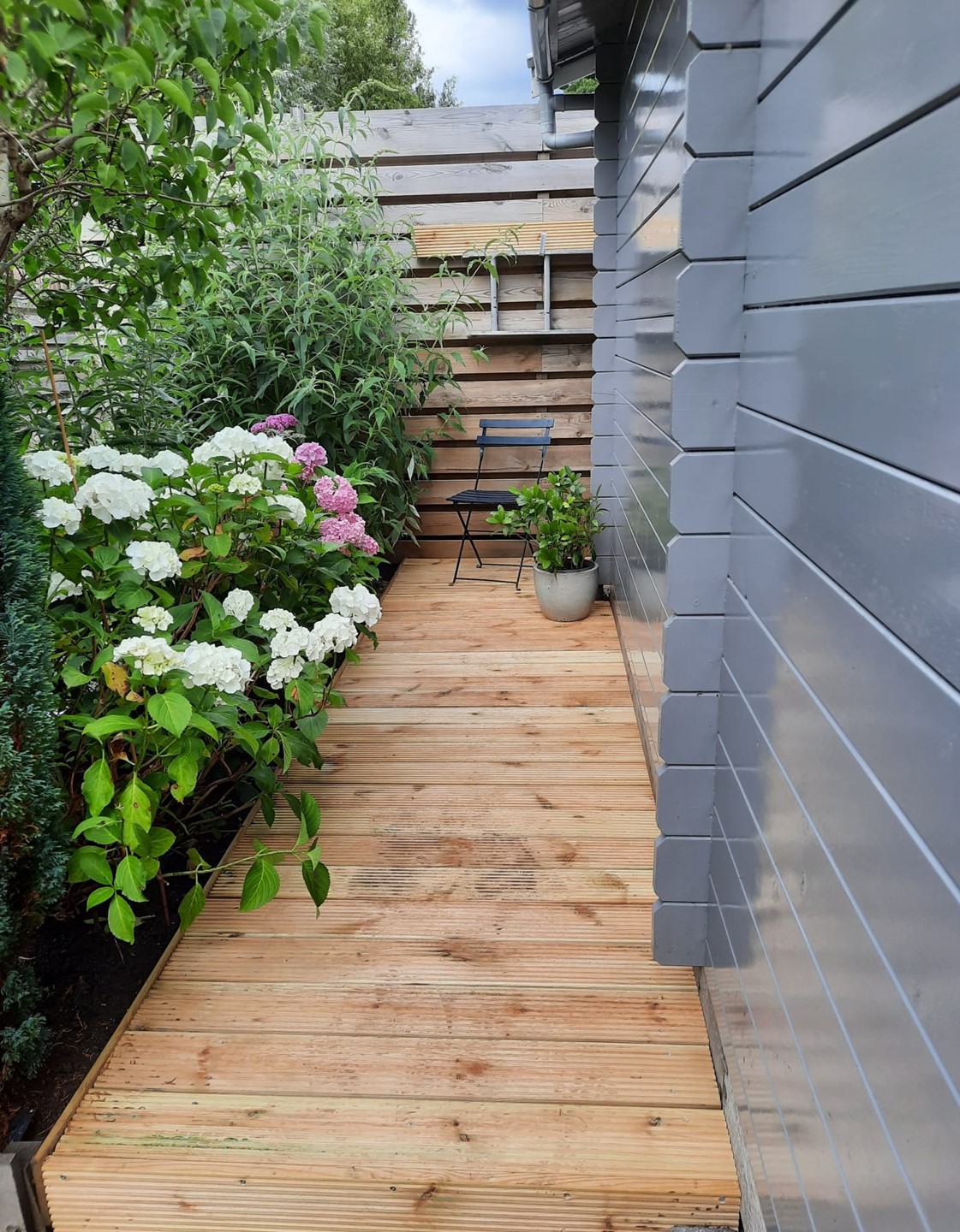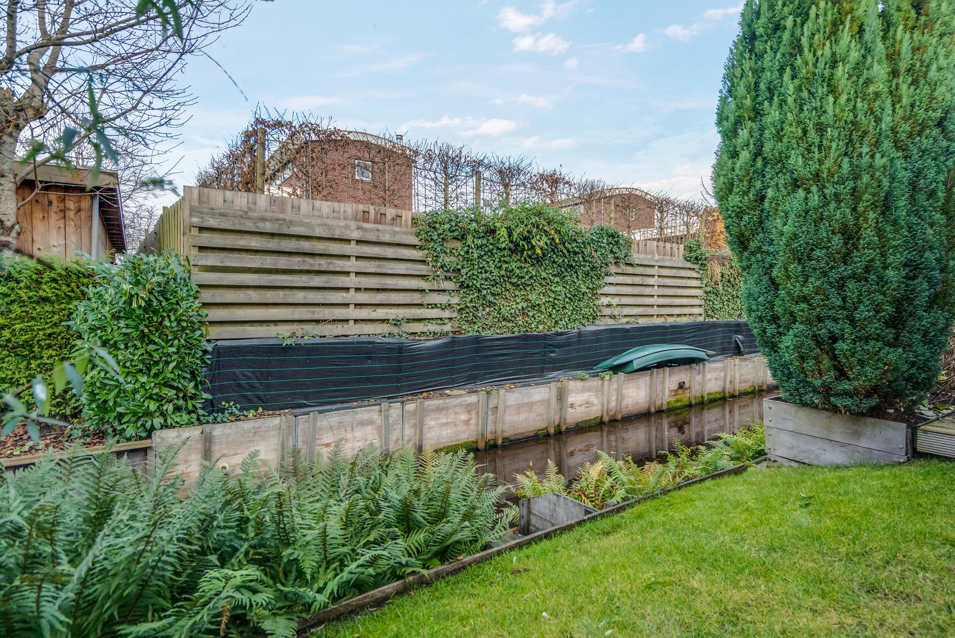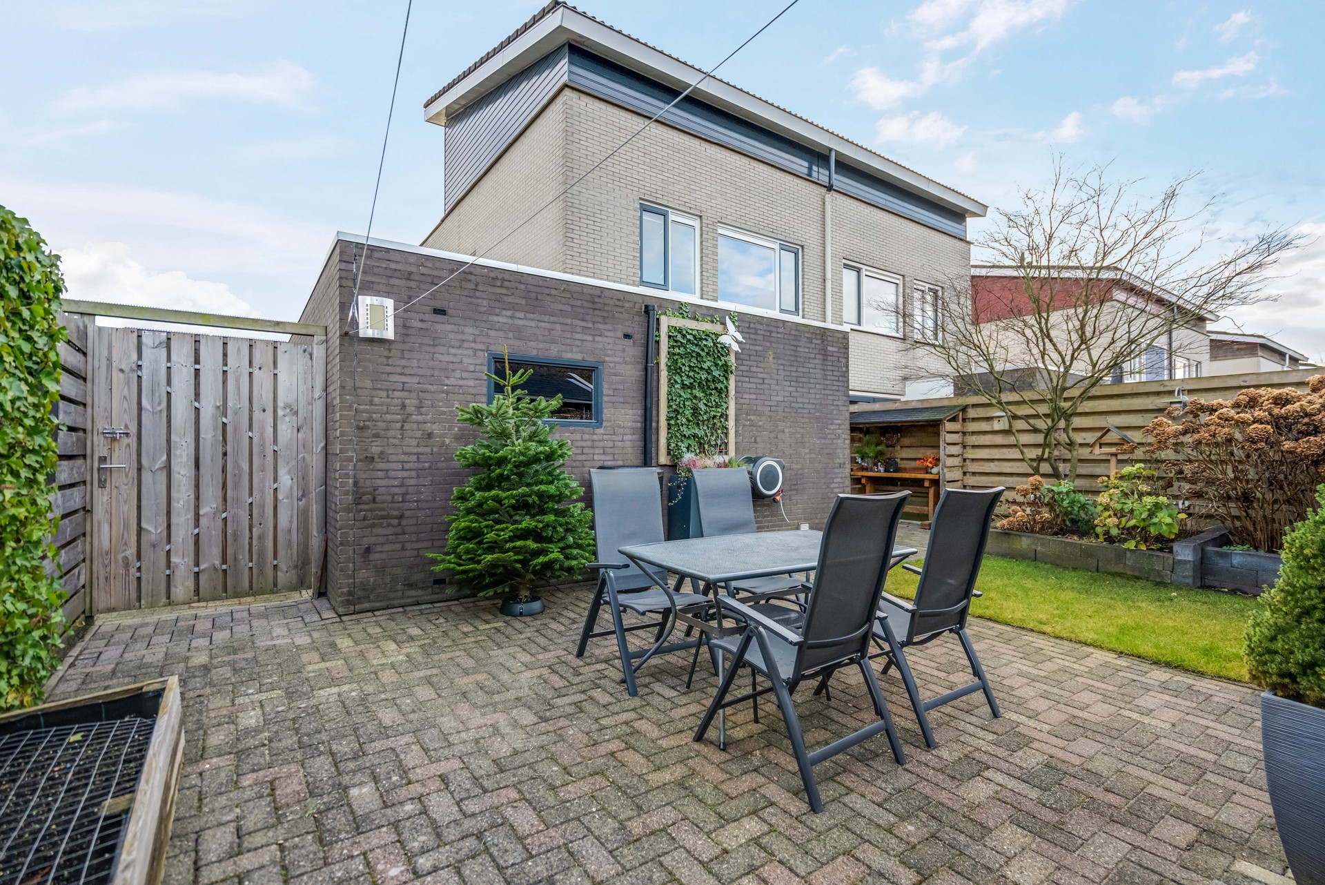 • Beschutte achtertuin met tuinhuisje en overkapping