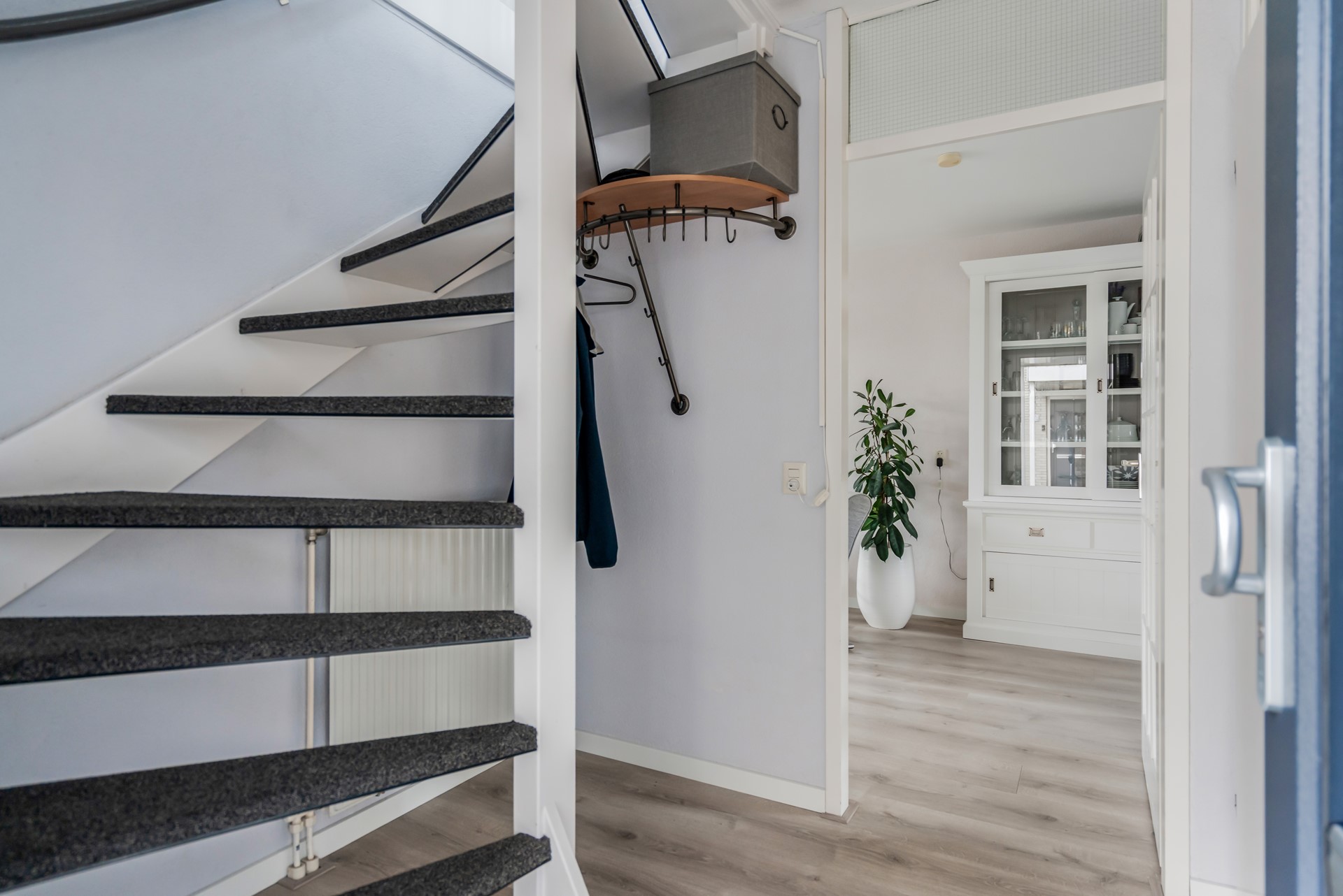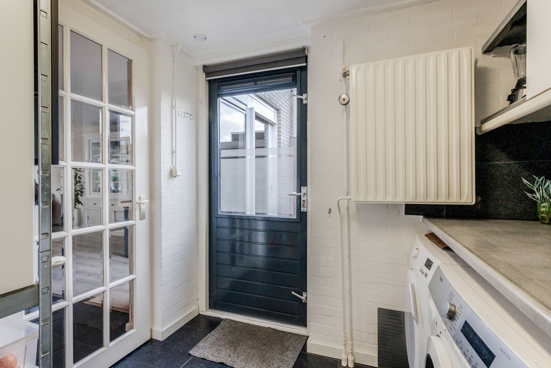 Aangrenzend vind je de bijkeuken: de ideale plek voor modderige laarsjes, sporttassen en de was. Vanuit de bijkeuken loop je door naar de garage en naar de achtertuin.