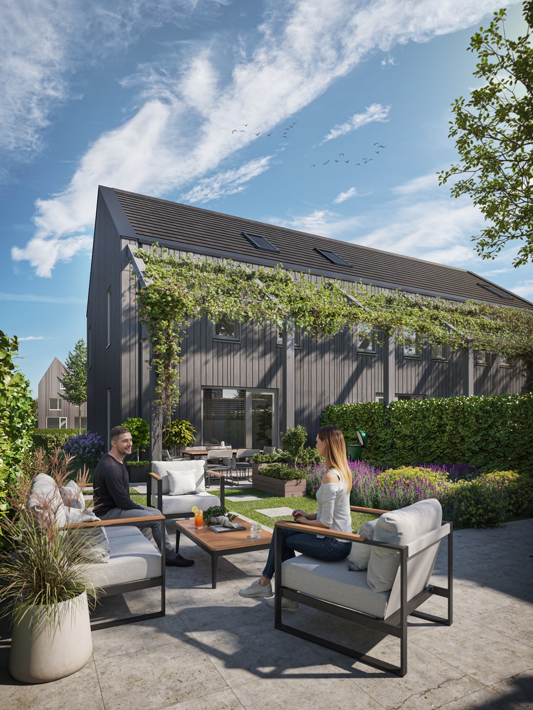 De tuingerichte woonkamer sluit mooi aan op de zonnige achtertuin op het zuiden, waar je van ’s ochtends tot ’s avonds van de zon geniet. Bij enkele woningen (bouwnummer 18, 19, 25 t/m 27) zorgt een robuuste houten pergola voor extra sfeer en een beschutte plek voor heerlijke zomeravonden.